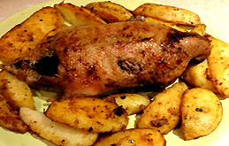 Рецепт жареного гуся с яблоками: тушку гуся снаружи и изнутри натереть солью. Приготовить смесь для фаршировки гуся: очищенные от кожицы и семечек четвертинки яблок смешать с предварительно замоченным изюмом и сахаром. Полученной смесью нафаршировать гуся и прорезь зашить нитками. Гуся уложить на противень спинкой вниз, добавить полстакана воды и поставить в духовку. Когда гусь подрумянится, перевернуть его спинкой - кверху. Огонь убавить и поливать образующимся на противне жиром через каждые 5-10 минут. Гусь готовится около 3 часов. За полчаса до готовности обложить гуся оставшимися целыми яблоками, полить их жиром и запечь. Из готового гуся удалить нитки и вынуть фарш. Фарш выложить на блюдо, украсить зеленью; сверху разместить гуся, вокруг - уложить печеные яблоки, в серединку которых следует вставить маслины. |
